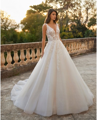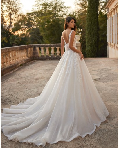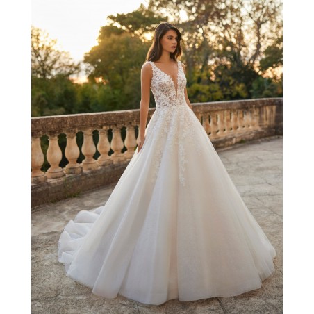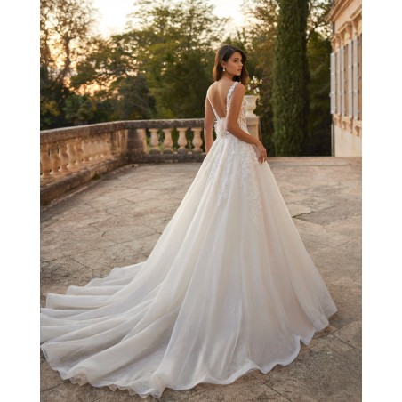 Robe de mariée ligne A en tulle avec dentelle perlée – Décolleté profond & dos ouvert | Rosa Clará