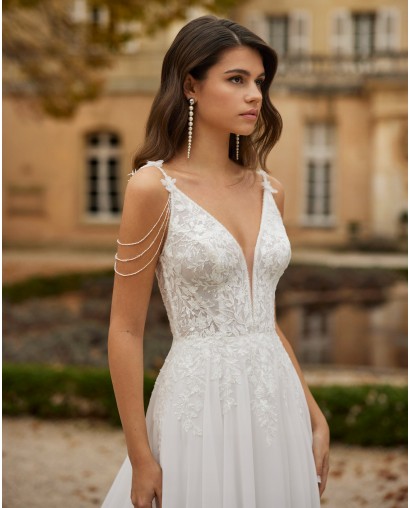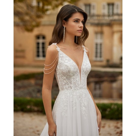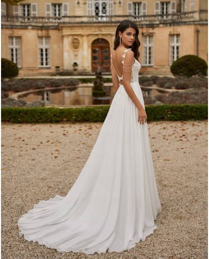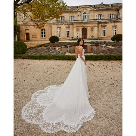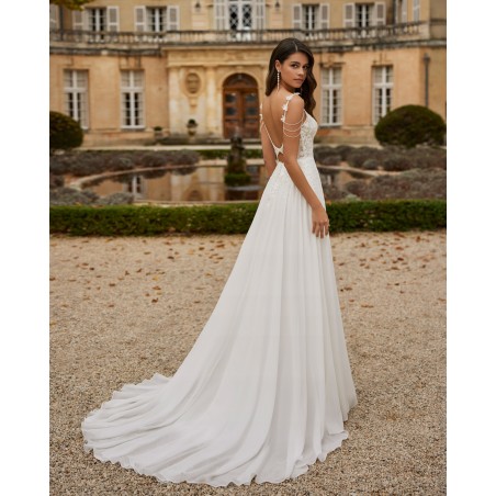 Robe de mariée droite en georgette avec dentelle perlée – Décolleté profond & dos ouvert | Rosa Clará