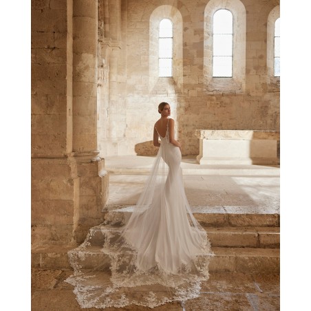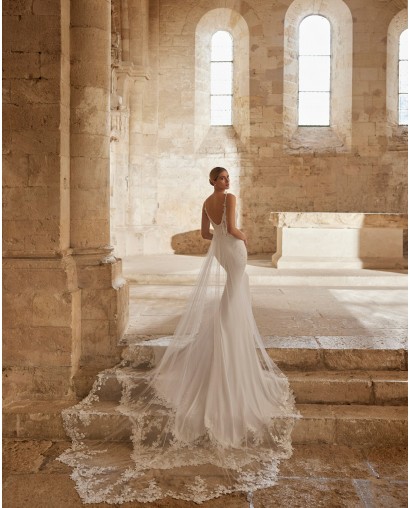 Cette robe de mariée sublime la silhouette avec sa coupe en crêpe bi-élastique, offrant confort et maintien. Le corsage en dentelle séduit par un décolleté profond et de fines bretelles, tandis que le dos plongeant ajoute une note sensuelle. La traîne ornée de dentelle apporte une touche majestueuse, sublimée par une sur-jupe fluide qui crée un effet spectaculaire et modulable selon les moments de la cérémonie. Une pièce pensée pour la mariée moderne qui veut conjuguer féminité, élégance et légèreté.