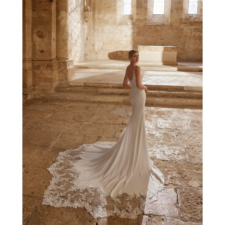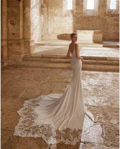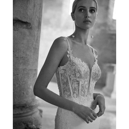 Robe de mariée en crêpe bi-élastique avec corsage en dentelle et sur-jupe