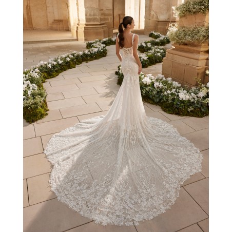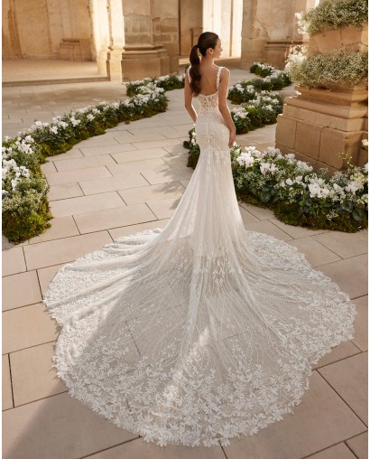 Les détails floraux et les jeux de transparence apportent une touche délicate, tandis que le dos nu subtilement travailléintensifie la féminité de la pièce. La jupe ajustée s’évase avec fluidité pour révéler une traîne spectaculaire en dentelle brodée, véritable atout de majesté qui sublimera l’entrée de la mariée.
