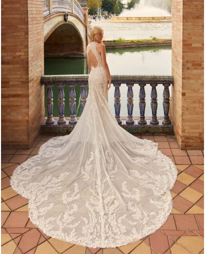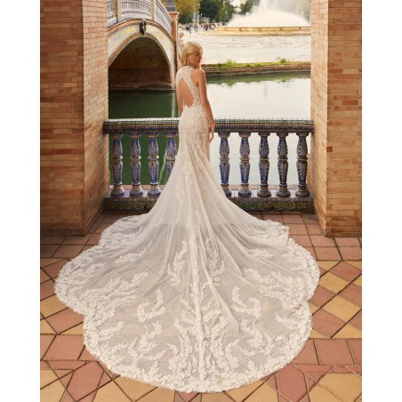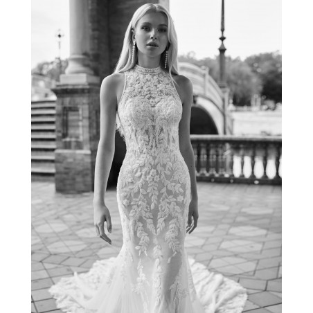 Ce modèle signé Rosa Clará (Aire Barcelona) est destiné à la mariée moderne qui souhaite allier élégance, audace et romantisme, avec un jeu de transparence et de broderies qui captivent le regard.