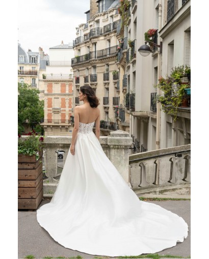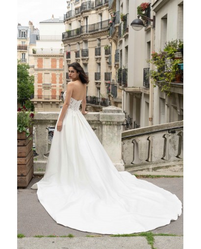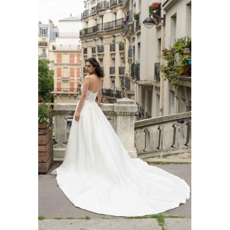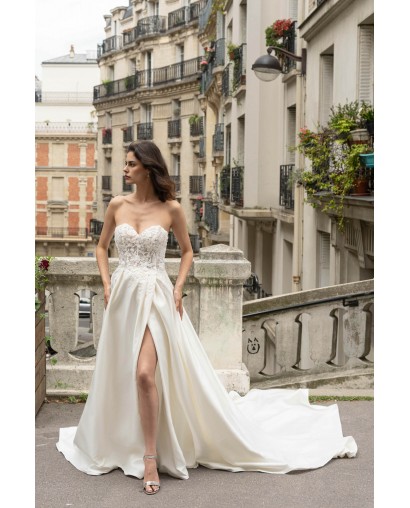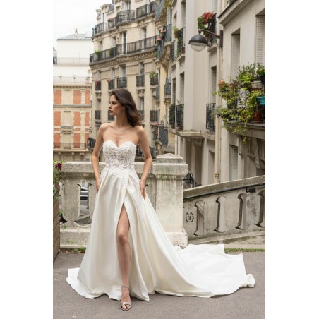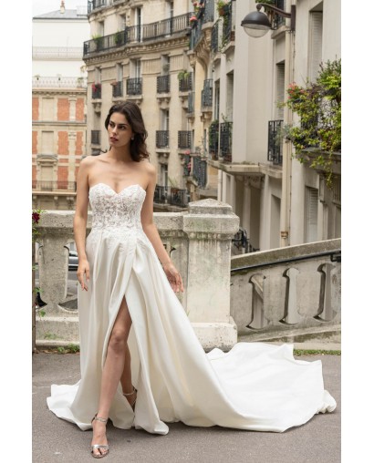 Cette robe de mariée conjugue raffinement et audace. Son bustier en forme de cœur, délicatement brodé de dentelle, met en valeur le buste avec élégance tandis que la jupe en satin fluide s’ouvre sur une fente subtile qui allonge la silhouette et révèle la jambe avec sensualité. Sa traîne légère et son éclat satiné subliment chaque mouvement, pour une allure moderne et glamour.