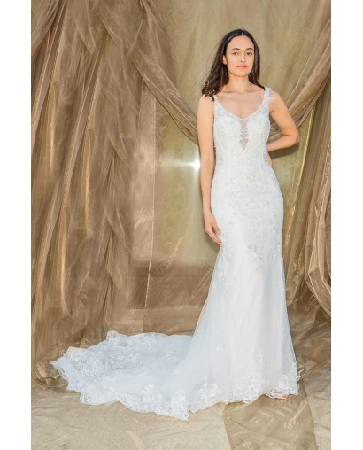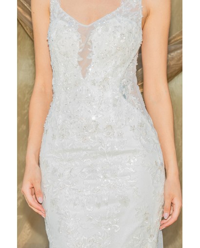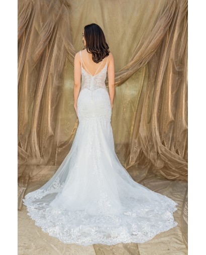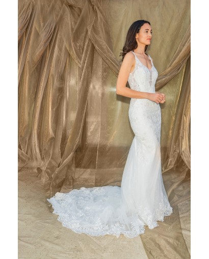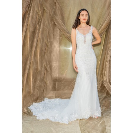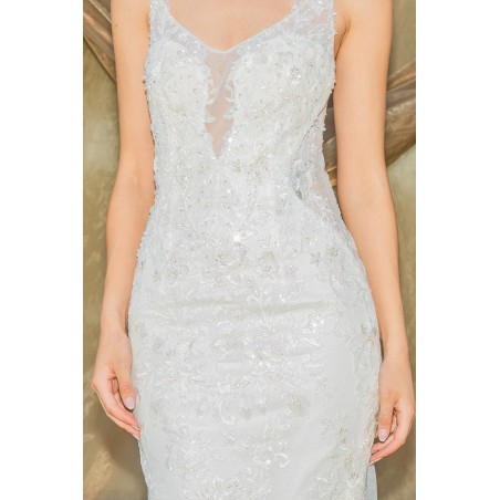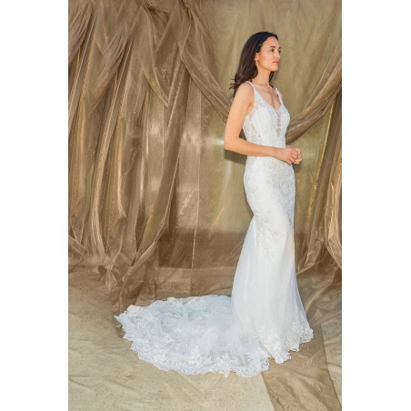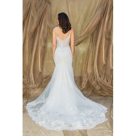 Robe de Mariée Sirène en Tulle avec Dentelle, Perles et Bretelles