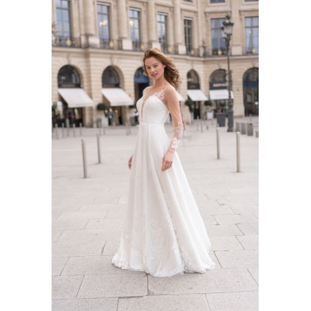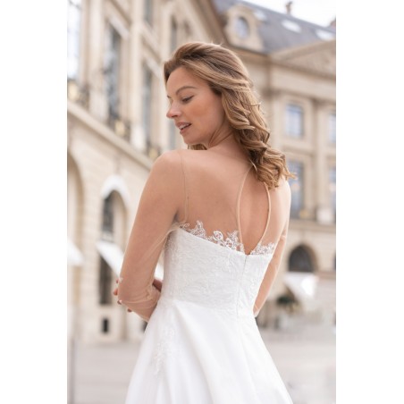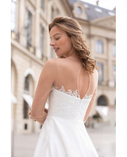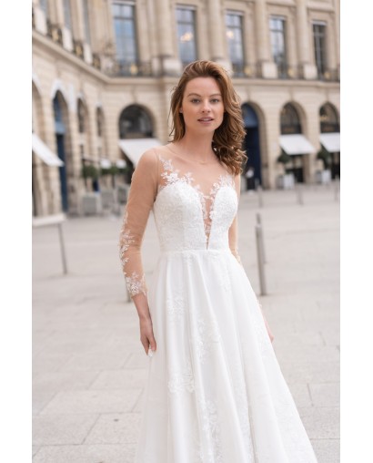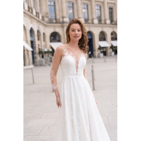 Robe de mariée coupe princesse en tulle léger, dotée de manches longues avec un effet tatouage délicat, créant une allure romantique et sophistiquée. Le buste est souligné par de fines bretelles et une encolure en V échancrée, apportant une touche de féminité. Modèle élégant et raffiné, idéal pour une silhouette majestueuse.