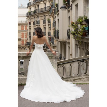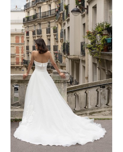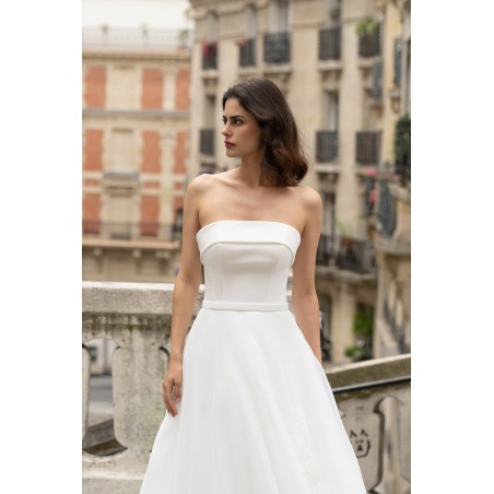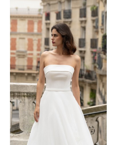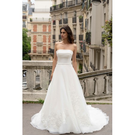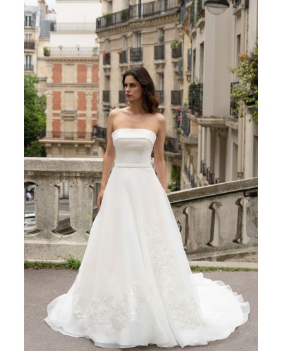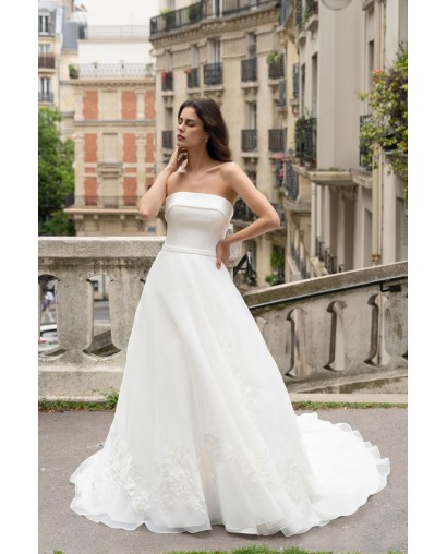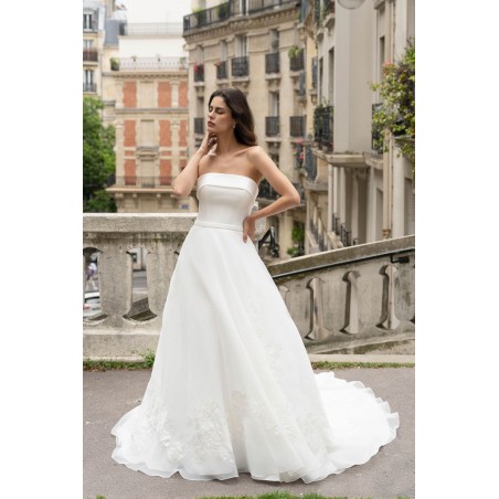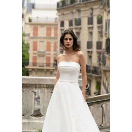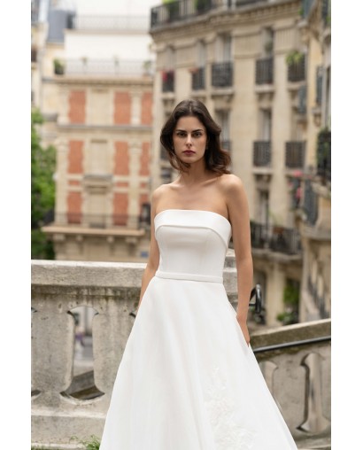 Cette robe de mariée allie la pureté des lignes minimalistes à la douceur d’une féminité intemporelle. Son bustier droit, parfaitement structuré, met en valeur les épaules et le port de tête avec élégance. La jupe en A-line, aérienne et légère, est délicatement soulignée par de fines broderies florales qui apportent une touche romantique tout en subtilité.