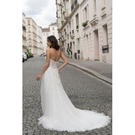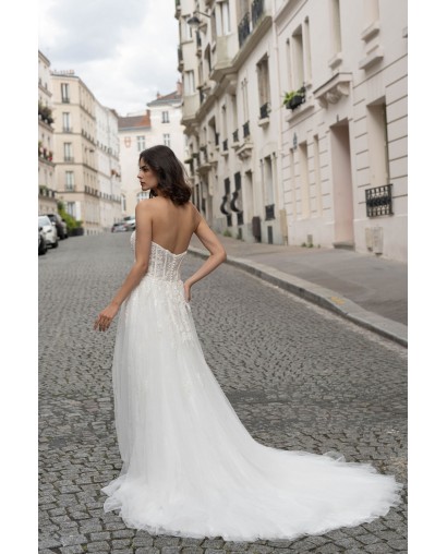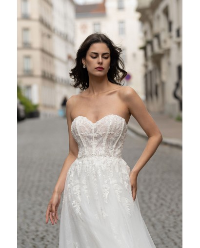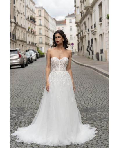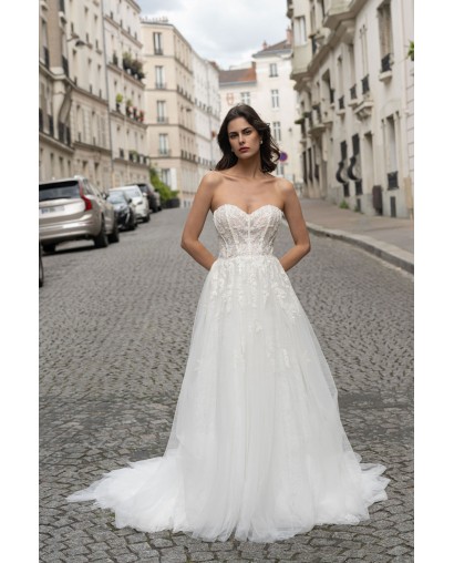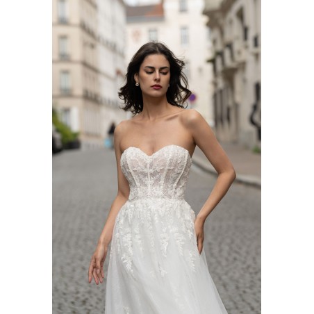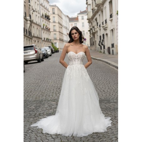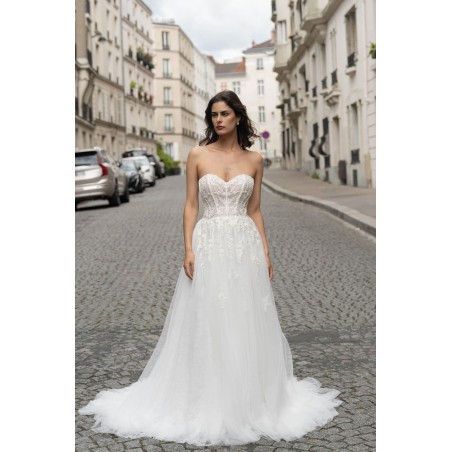 Cette robe de mariée conjugue douceur et élégance avec son bustier en cœur structuré et délicatement brodé de motifs floraux. Le corsage façon corset met en valeur la silhouette tout en légèreté, tandis que la jupe en tulle fluide crée un mouvement vaporeux à chaque pas. Sa traîne légère complète cette création tout en raffinement, parfaite pour une mariée moderne au charme romantique.