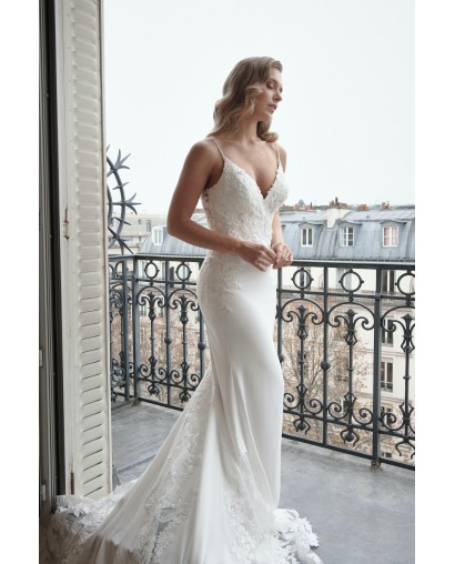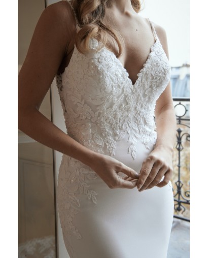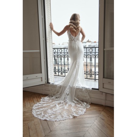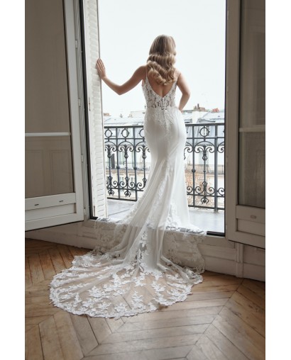 Le corsage est sublimé par une dentelle florale raffinée, qui se prolonge harmonieusement sur la jupe pour créer un effet visuel élancé et flatteur. La coupe près du corps épouse la silhouette avec douceur avant de s’ouvrir sur une traîne en tulle brodé, aérienne et romantique.