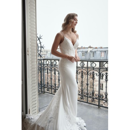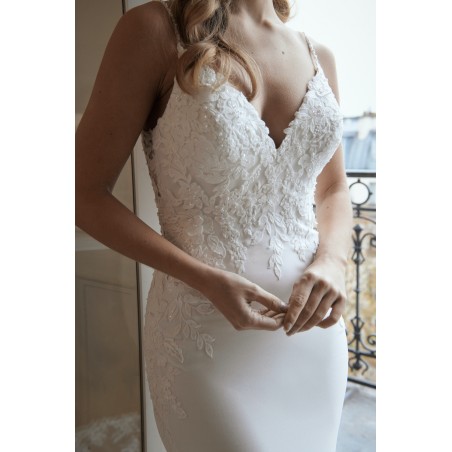 Robe de mariée élégante et féminine au décolleté en V délicat et fines bretelles.