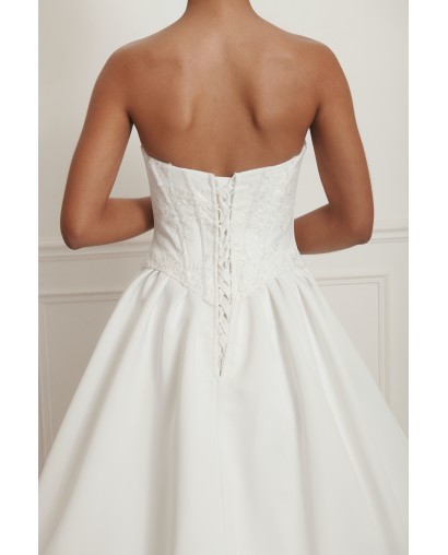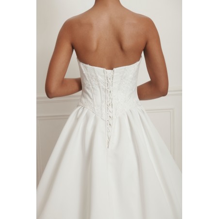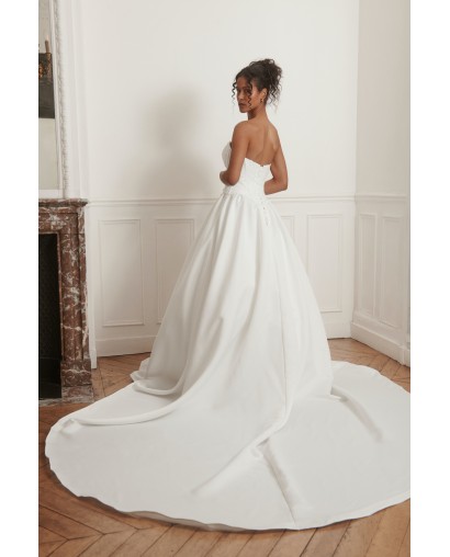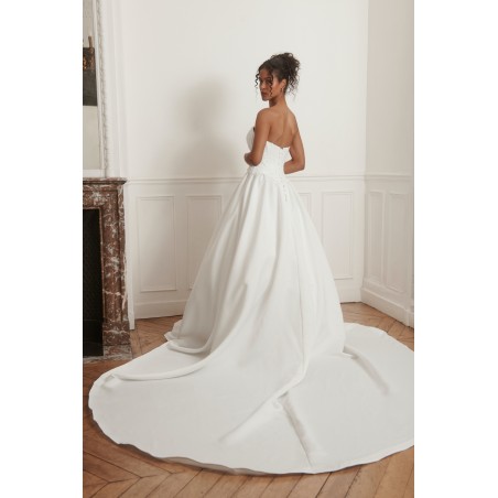 Robe de mariée élégante au bustier cœur structuré, mettant en valeur le décolleté et la silhouette.