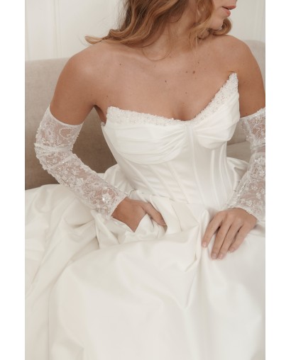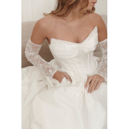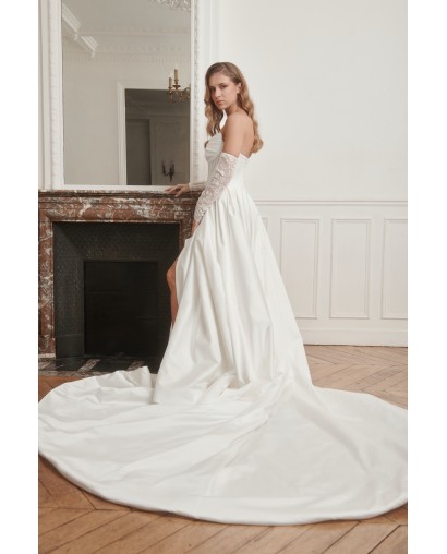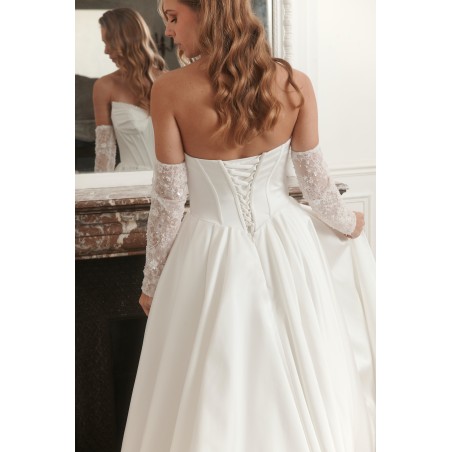 La taille est marquée avec justesse, laissant place à une jupe ample et fluide qui offre volume, confort et légèreté. Le jeu de matières entre le corsage structuré et la douceur de la jupe crée une allure gracieuse et harmonieuse, idéale pour une mariée moderne en quête d’élégance intemporelle.