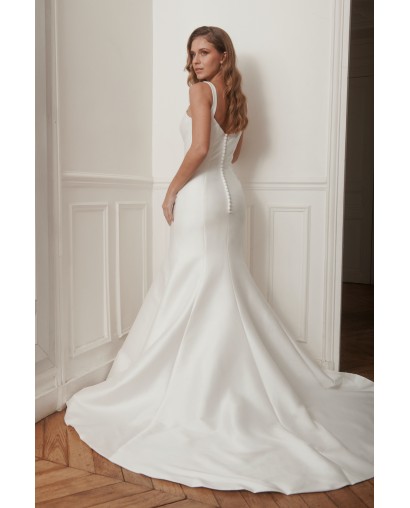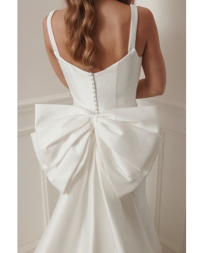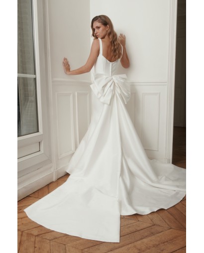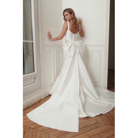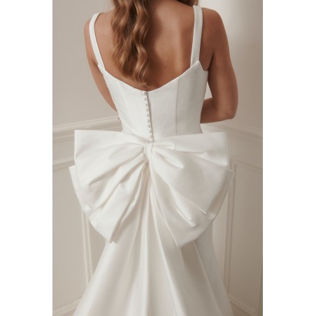 Le dos est sublimé par un nœud couture spectaculaire, apportant caractère et originalité à la robe sans en altérer la pureté. La jupe fluide s’ouvre sur une traîne élégante, offrant une allure élancée et gracieuse à chaque pas.