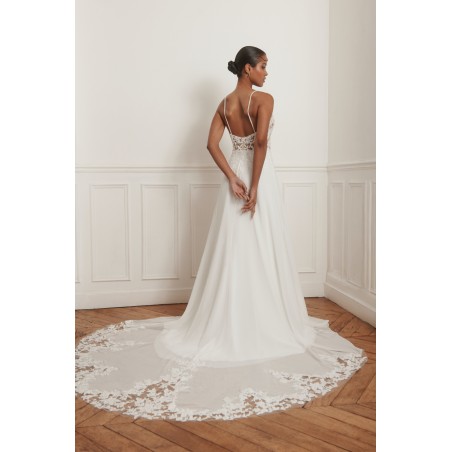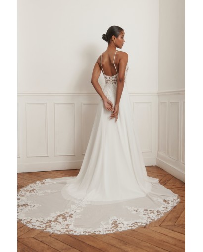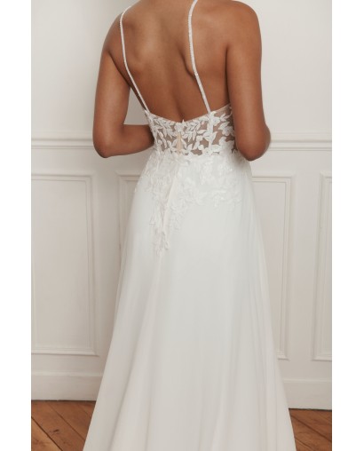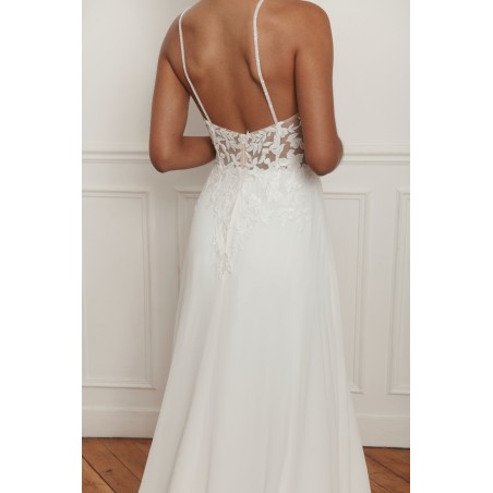 La jupe fluide épouse la silhouette avec naturel avant de se prolonger par une traîne légère bordée de dentelle florale, offrant une allure gracieuse et aérienne. Le dos délicatement travaillé complète cette silhouette élégante et harmonieuse.