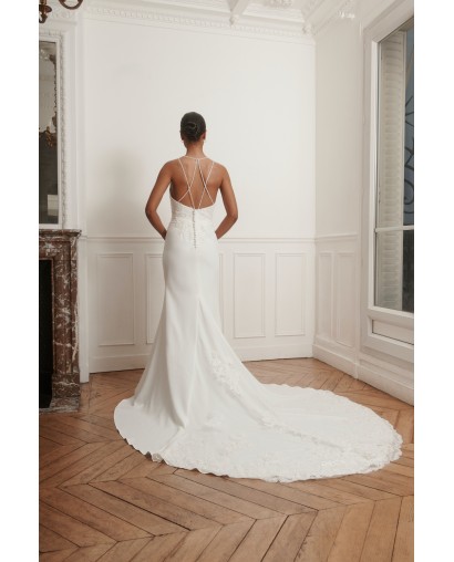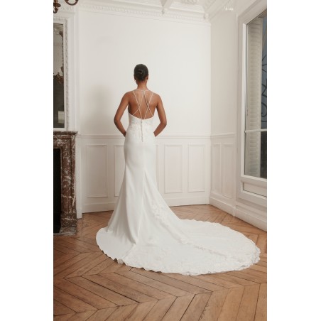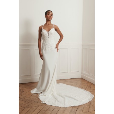 Robe de mariée élégante et moderne avec bustier en dentelle, jupe fluide et dos nu à fines bretelles croisées. Idéale pour un mariage chic ou civil.