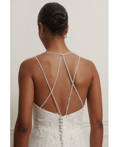 Le dos nu, sublimé par de fines bretelles croisées, apporte une touche sensuelle et contemporaine.