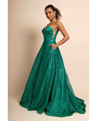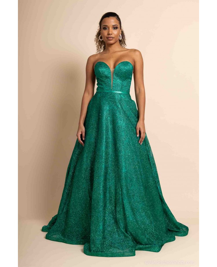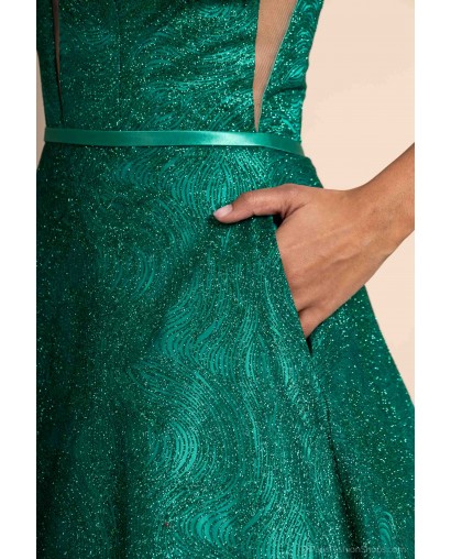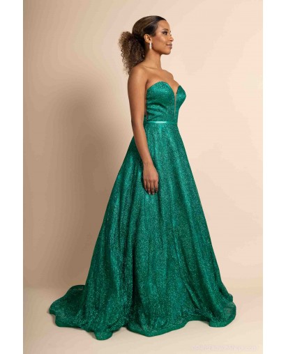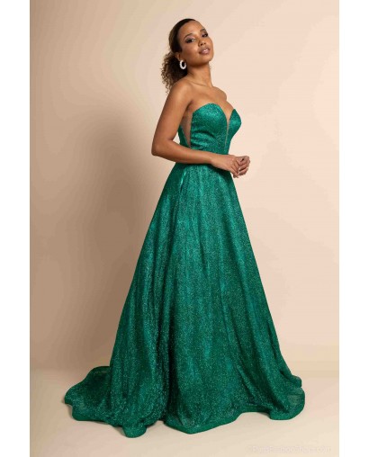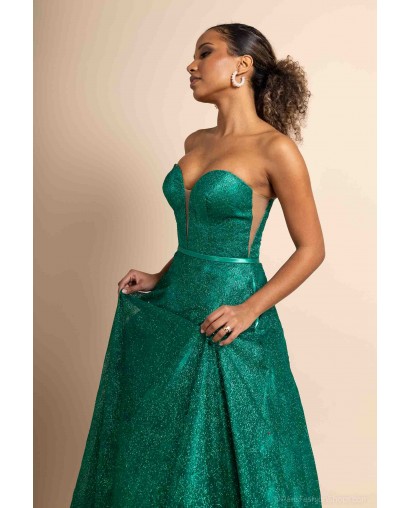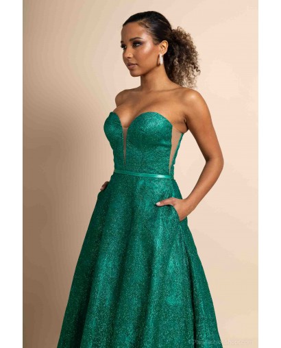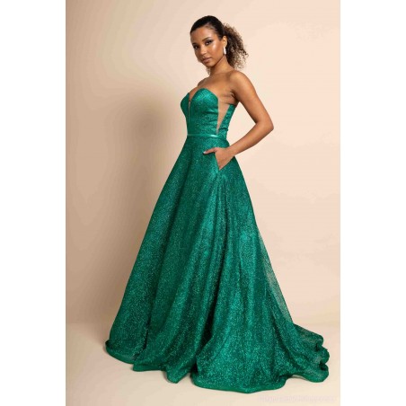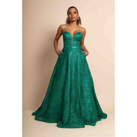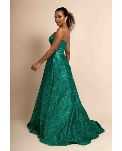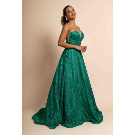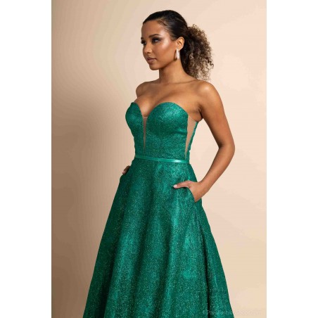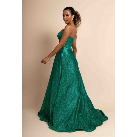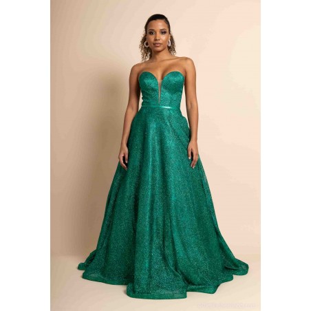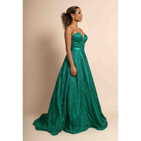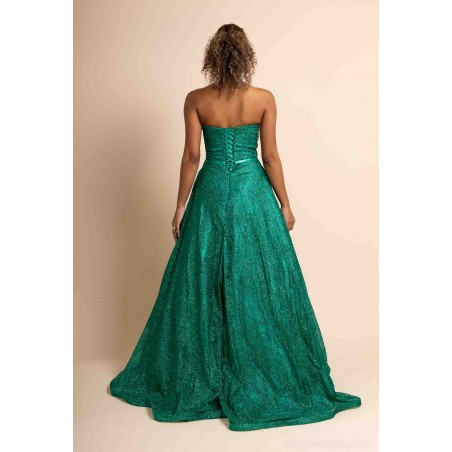 Optez pour une allure féerique avec cette somptueuse robe de cocktail bustier coupe princesse, conçue pour briller en toute occasion. Sa teinte verte intense et son tissu entièrement recouvert de paillettes scintillantes captent la lumière et subliment la silhouette avec éclat.