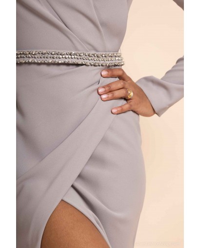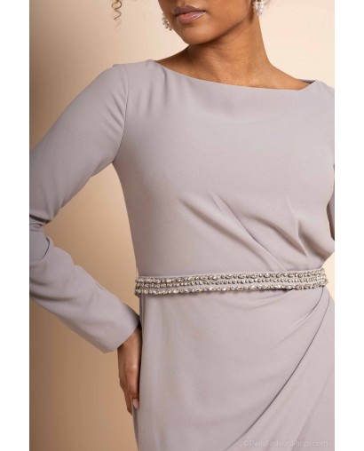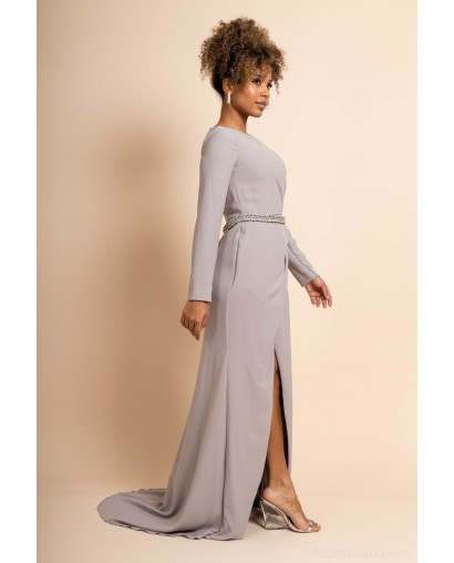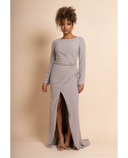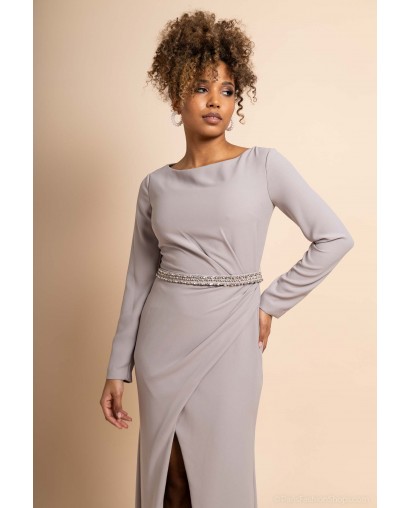 Son encolure étroite arrondie apporte une touche élégante et épurée, tandis que ses manches longues ajoutent une note de raffinement. Sa coupe fourreau ajustée, sublimée par une fente discrète, allonge la silhouette avec élégance. La ceinture perlée incluse marque délicatement la taille, apportant une finition précieuse et lumineuse.